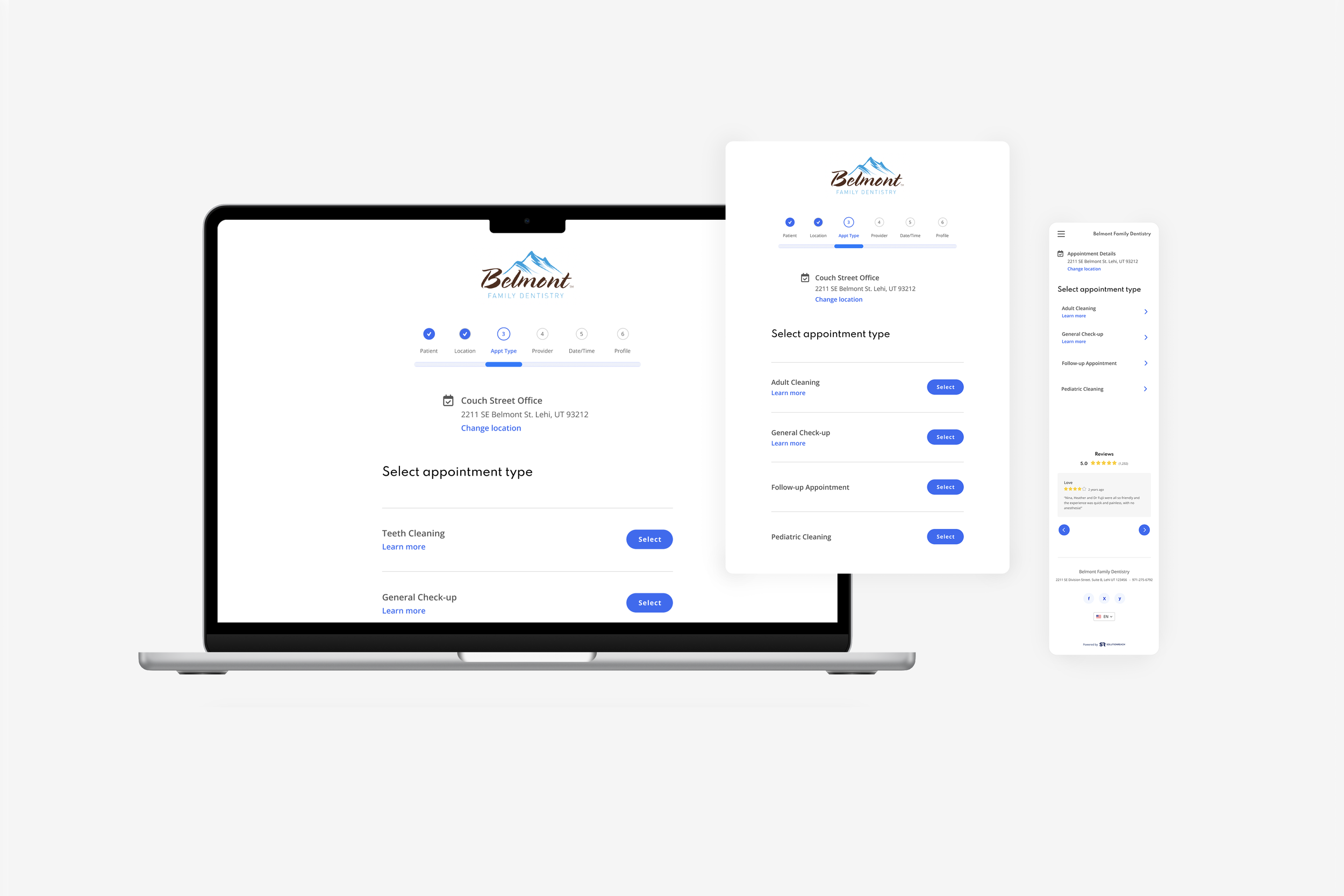 This project focused on modernizing the company’s scheduling interface to better support business goals for a diverse range of healthcare specialties. The new responsive design provides a seamless, end-to-end experience that guides users from selecting locations and appointment types to confirming times within an accessible and intuitive interface.