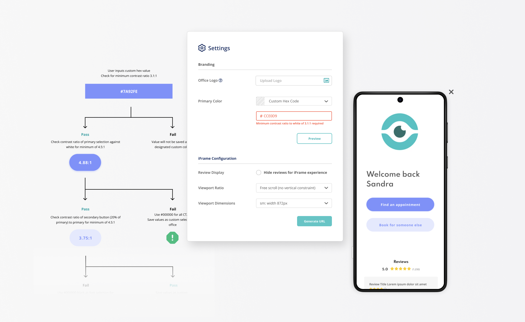 Defining settings allowing clients to create their own customized interface required establishing clear parameters to maintain design integrity. Limits on logo dimensions, predefined color palette options, the ability for users to select custom colors within accessibility-compliant contrast ratios, and iFrame ratios were all developed as part of this deliverable.